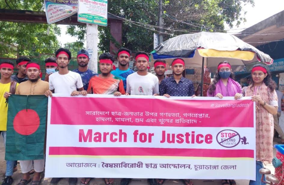 গত বছরের ৩১ জুলাই বৈষম্যবিরোধী ছাত্র আন্দোলনের ডাকে সারাদেশে ‘মার্চ ফর জাস্টিস’ কর্মসূচি পালিত হয়। ৩০ জুলাই রাতে কোটা সংস্কারের দাবিতে আন্দোলনরত শিক্ষার্থীদের প্লাটফর্ম “বৈষম্যবিরোধী ছাত্র আন্দোলন এ কর্মসূচি ঘোষণা করে। চুয়াডাঙ্গার শিক্ষার্থীরা অনলাইনে নিজেদের মধ্যে যোগাযোগ রাখলেও পুলিশের মারমুখী আচরণ ও সরকারদলীয় ক্যাডারদের হামলার ভয়ে তারা রাস্তায় নামতে পারেনি। তবে শিক্ষার্থীরা পরবর্তী আন্দোলনের জন্য নিজেদের মধ্যে যোগাযোগ অব্যাহত রাখে।