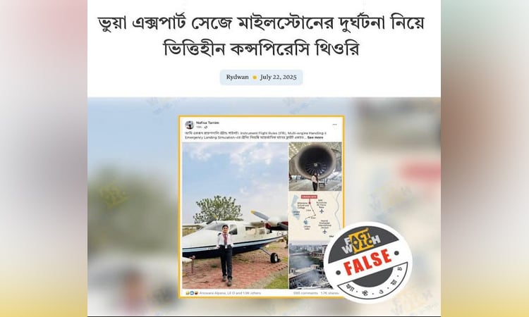 ফ্যাক্টওয়াচ অনুসন্ধান টিম জানায়, বিমান দুর্ঘটনাকে কেন্দ্র করে সামাজিক যোগাযোগ মাধ্যমে একটি দীর্ঘ পোস্ট ছড়িয়ে পড়েছে। পোস্টদাতা নিজেকে একজন ‘এভিয়েশন ট্রেইন্ড পাইলট’ হিসেবে পরিচয় দেন এবং দাবি করেন, বিমান দুর্ঘটনাটি নিছক দুর্ঘটনা নয়, বরং এটি একটি ‘সুপরিকল্পিত ষড়যন্ত্র’। আরো উল্লেখ করা হয়, এটি একটি নিখুঁতভাবে পরিকল্পিত ‘মিলিটারি-পিআর-অপারেশন’।